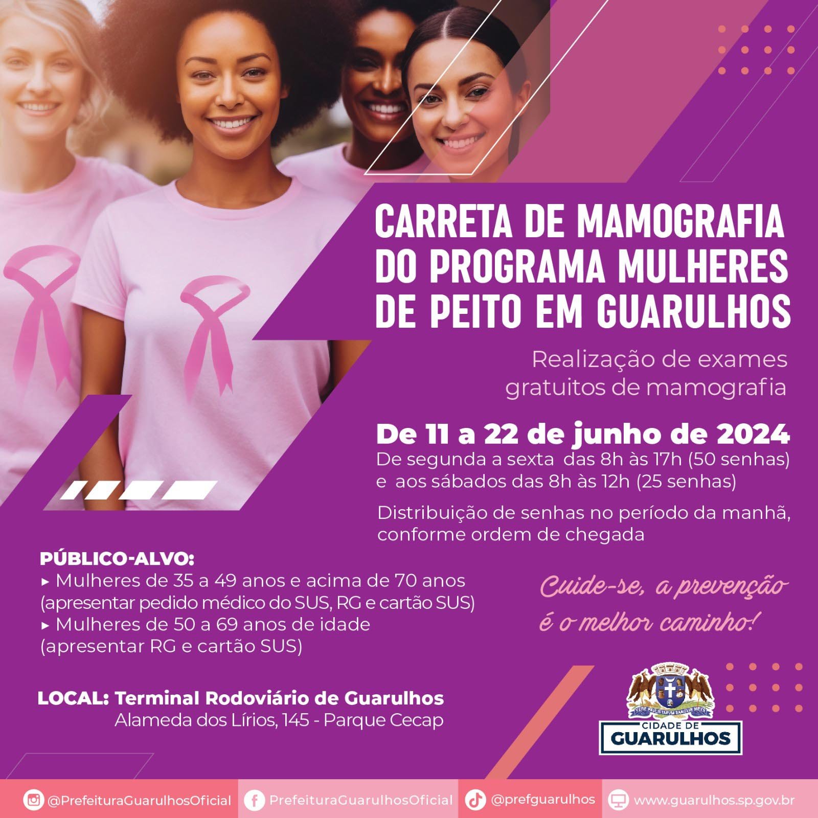 Da próxima terça-feira (11) até 22 de junho a carreta do programa estadual Mulheres de Peito fica em Guarulhos para oferecer gratuitamente o exame de mamografia sem necessidade de pedido médico a pessoas de 50 a 69 anos de idade, que deverão apresentar somente o RG e o cartão SUS. Mulheres de 35 a 49 anos e acima de 70 anos precisam levar pedido médico do SUS, RG e cartão SUS .