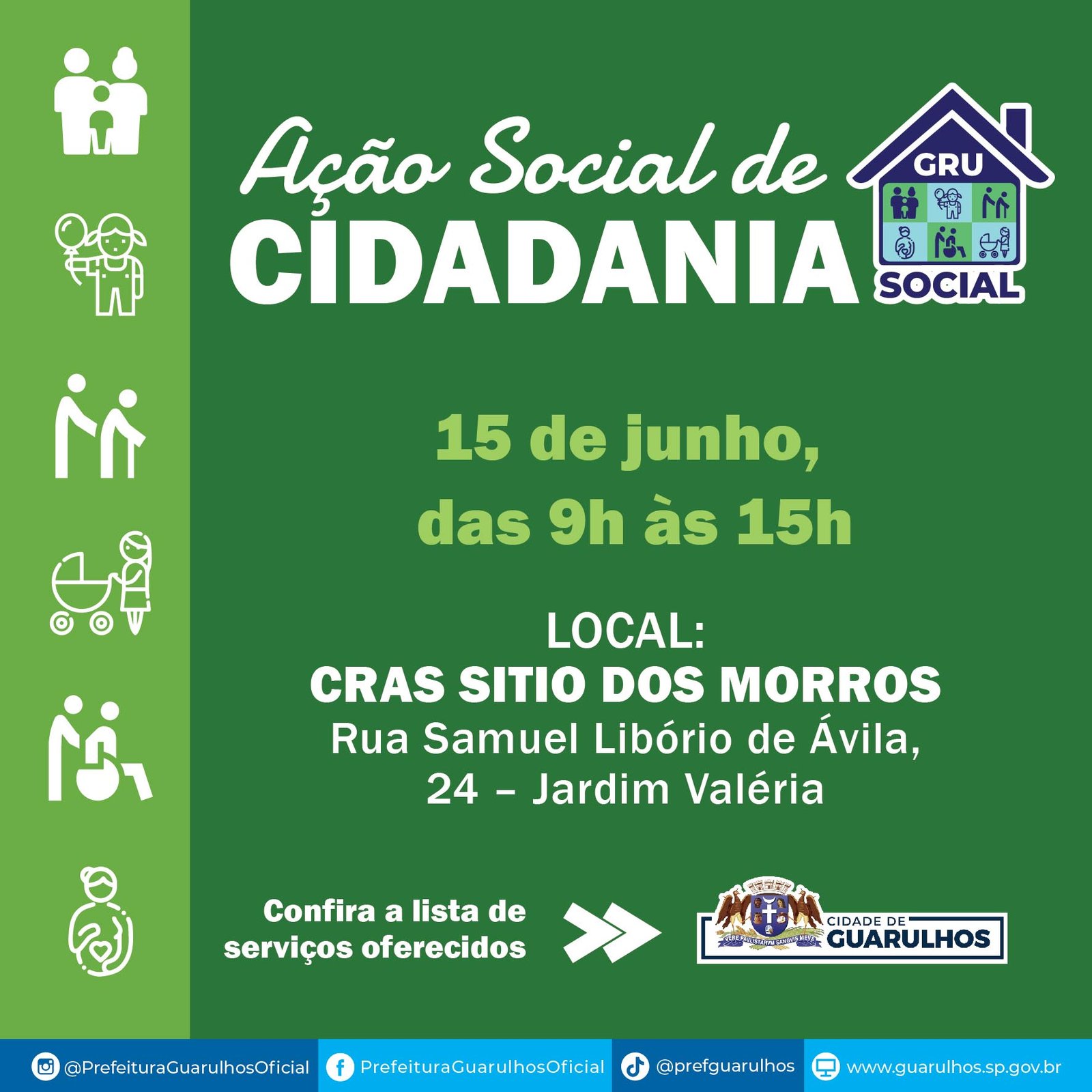 Especialmente no mês de junho, o GRU Social, iniciativa da Prefeitura de Guarulhos, terá duas edições. A segunda acontece no dia 15 de junho (sábado), das 9h às 15h, no Centro de Referência da Assistência Social (Cras) Sitio dos Morros, na rua Samuel Libório de Ávila, 24, Jardim Valéria.