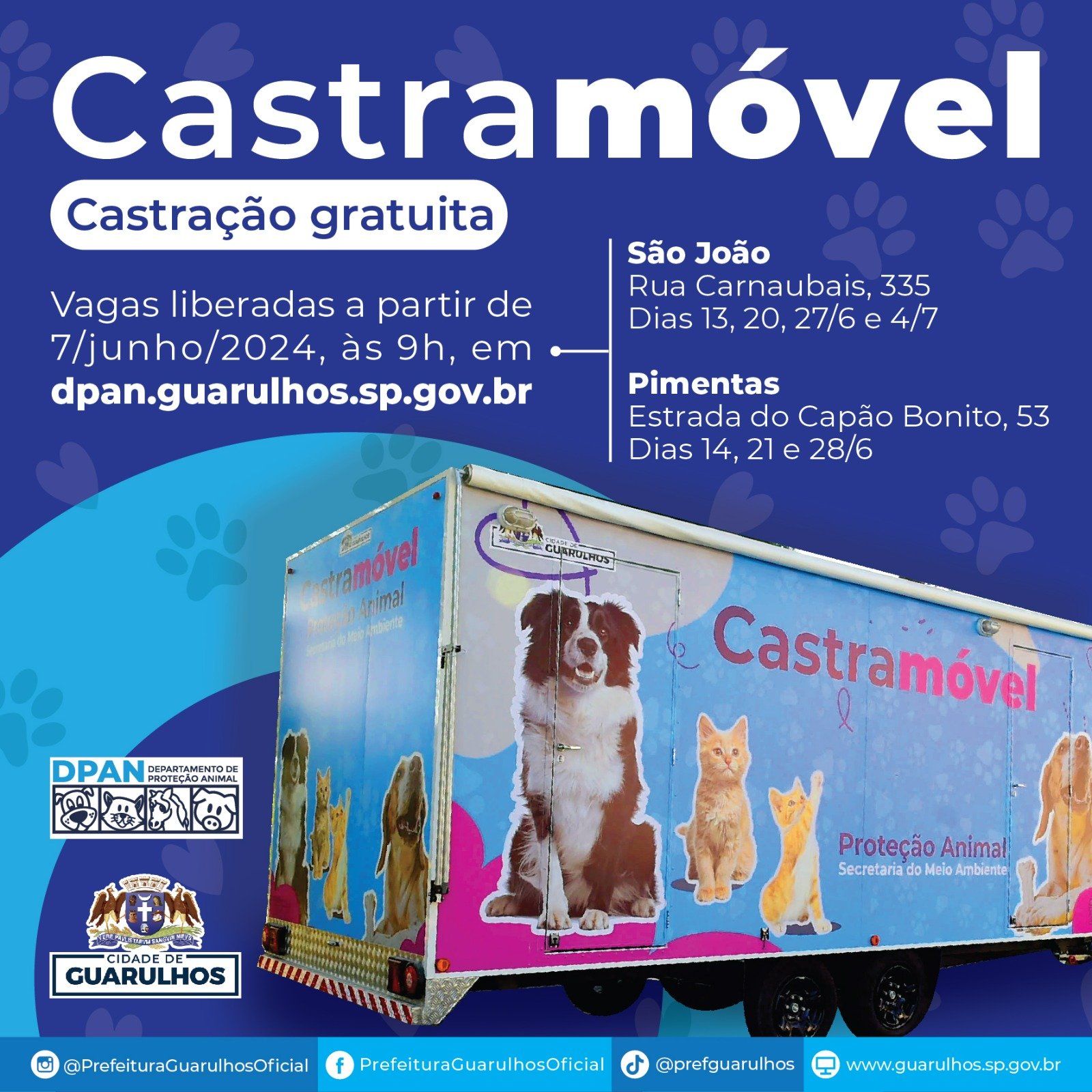A Prefeitura de Guarulhos abre nesta sexta-feira (7) as inscrições para 1.765 mil vagas disponíveis na campanha de junho de castração gratuita de cães e gatos. Para tentar uma vaga é necessário realizar antecipadamente um cadastro para a obtenção de login e senha e acessar a página www.dpan.guarulhos.sp.gov.br/agendamento para dar sequência ao processo. Cada munícipe pode castrar até dois animais a cada seis meses.